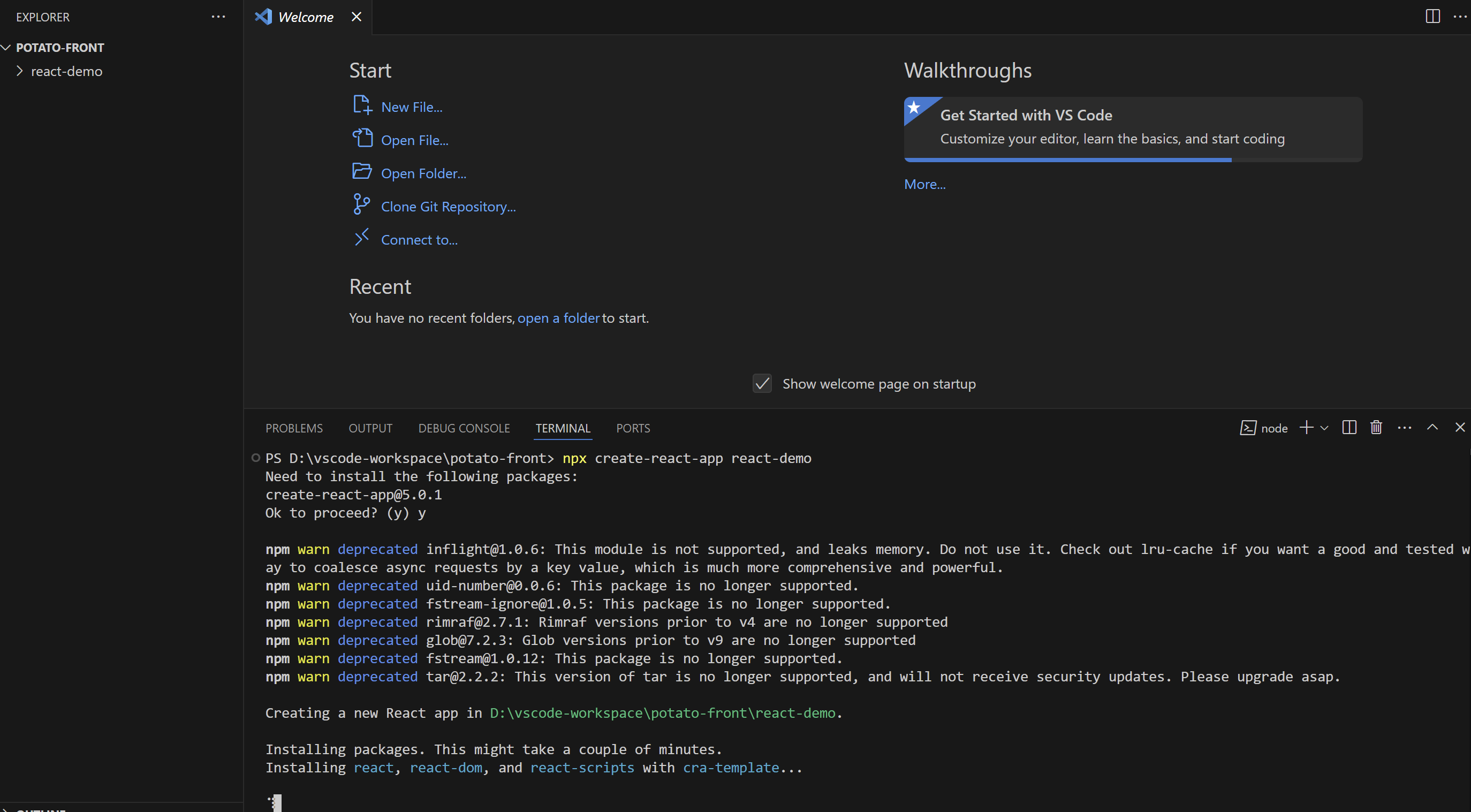 왼쪽 상단에 프로젝트가 생성된다. 이제 해당 경로 안에서 npm start 명령어로 실행시켜보자.